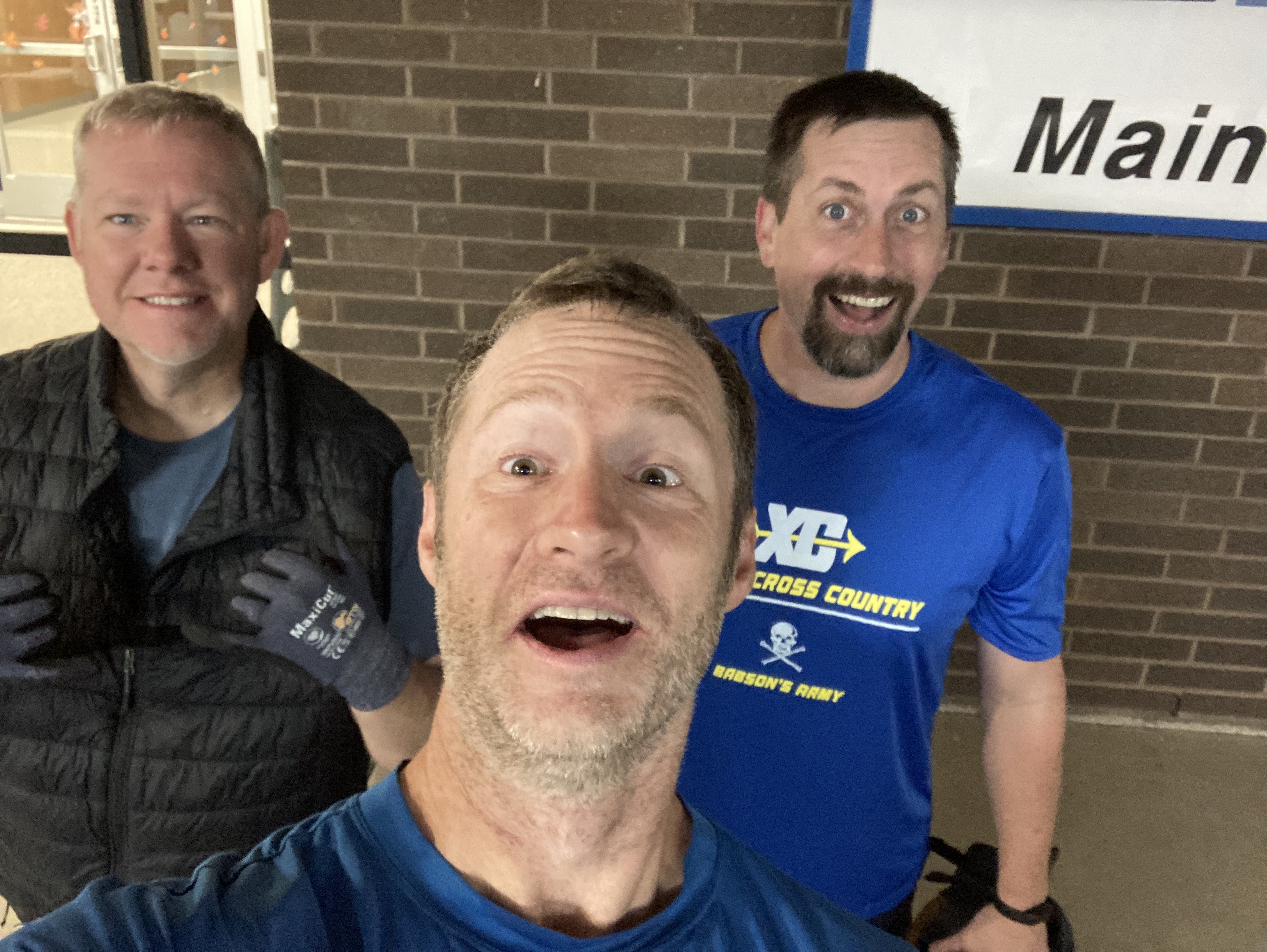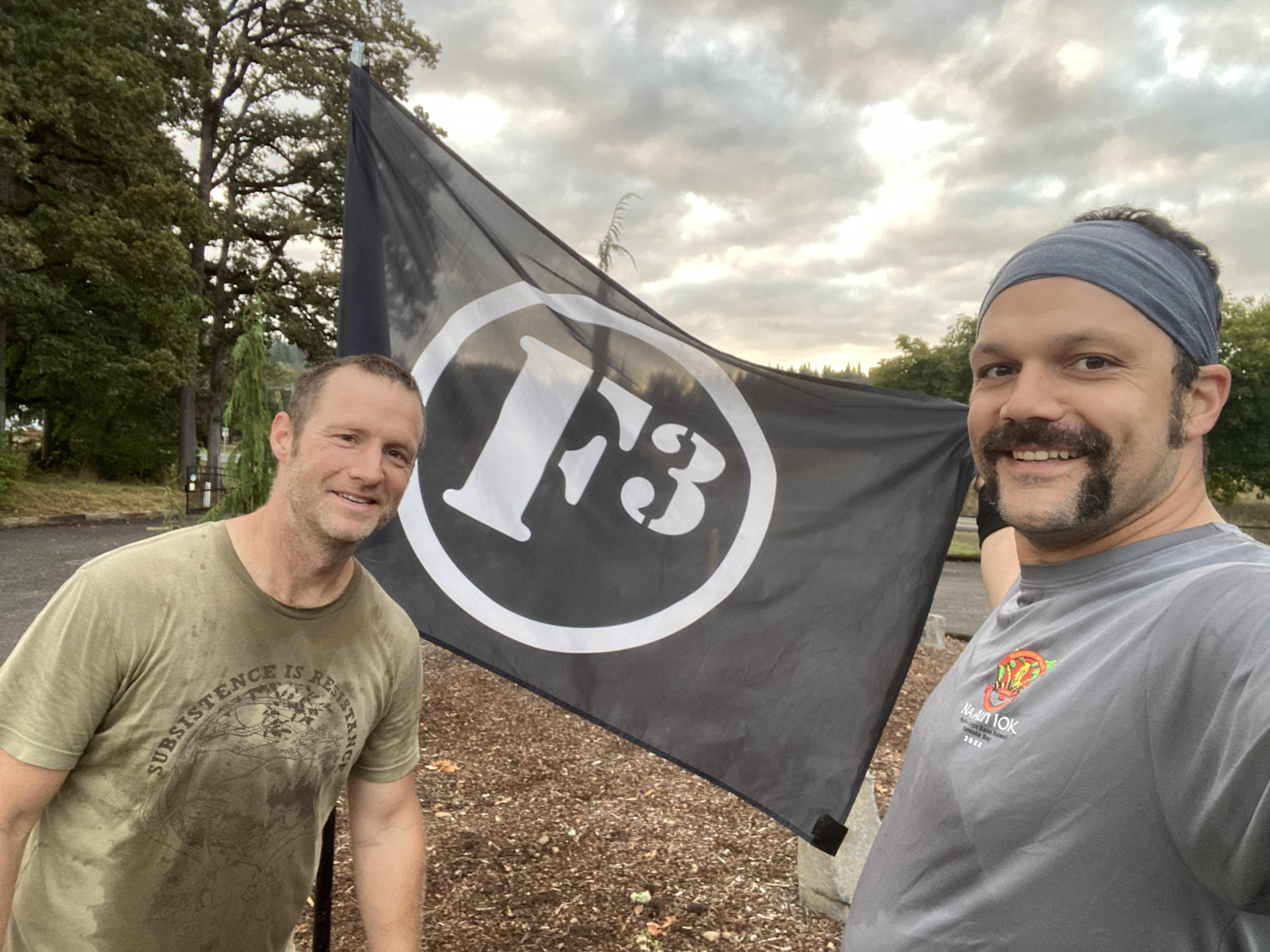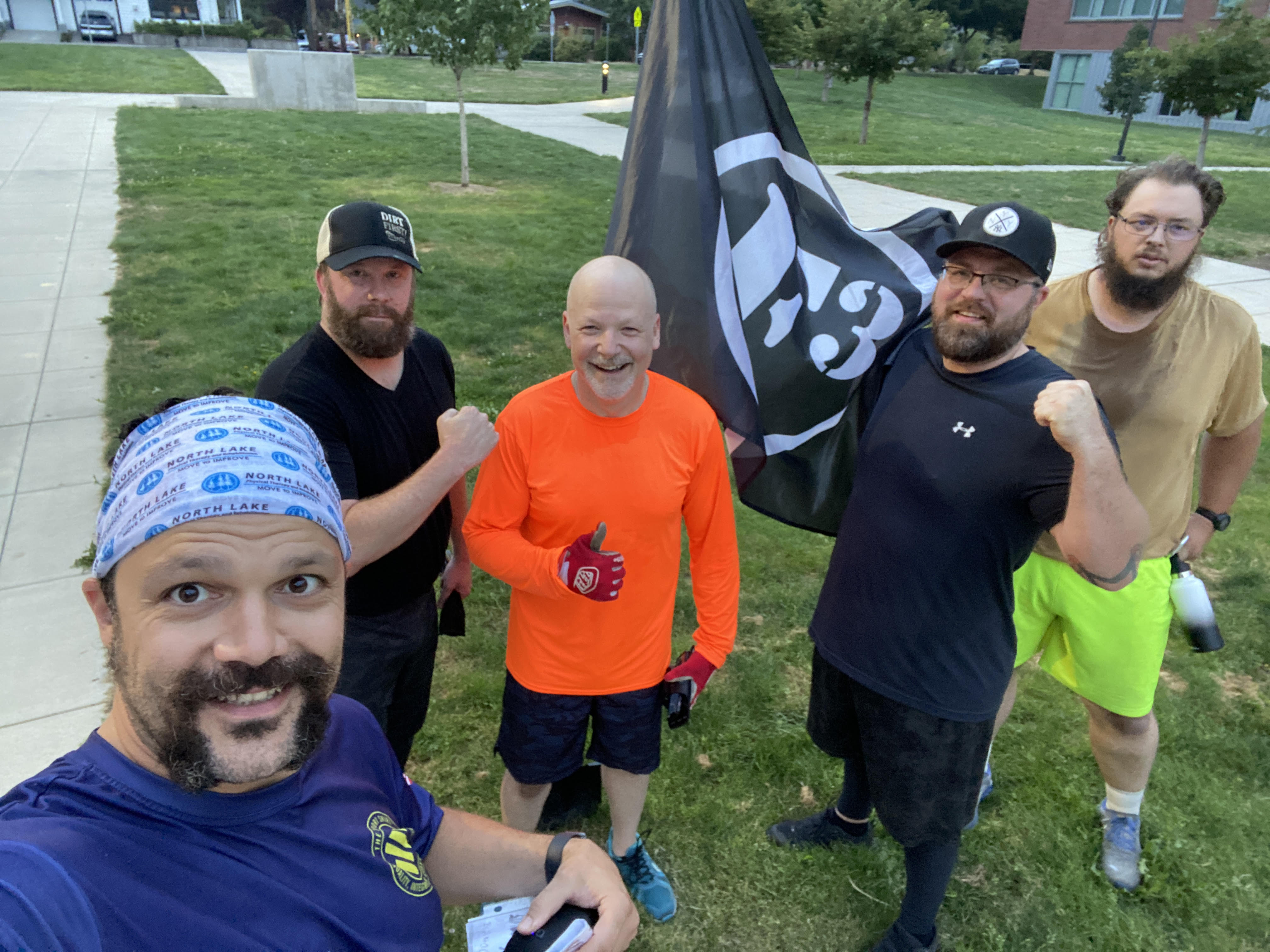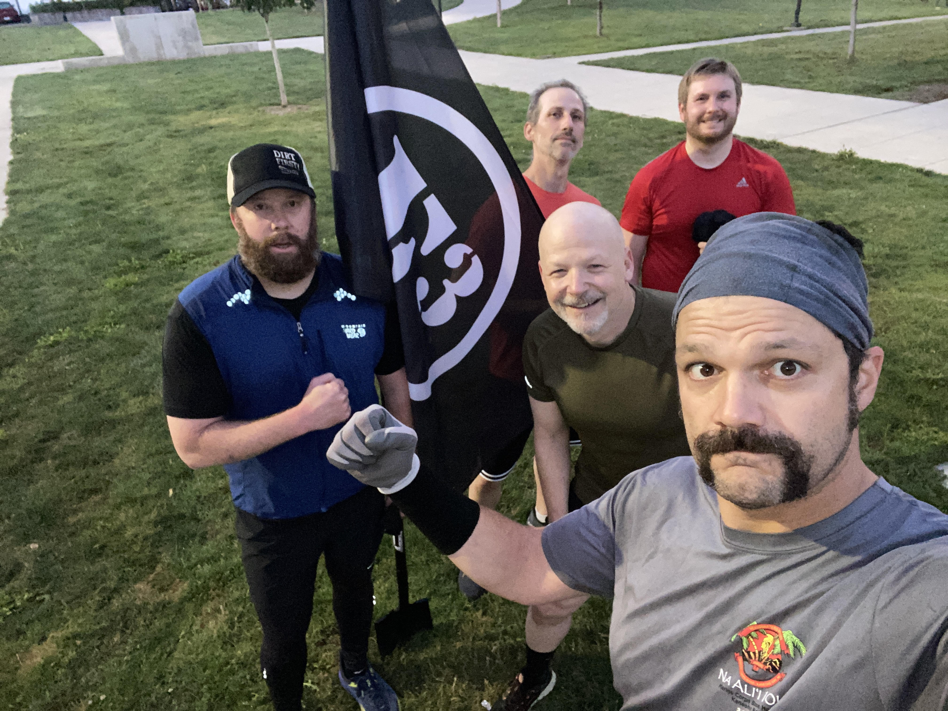 Now we’re gonna play a game called check on the flag: since our flags were nearly stolen by some community members a few weeks ago, we need to be better about making sure they are there! One HIM runs to make sure the flag is still in front of the school while the rest complete an exercise. He has to run and touch the flag and run back. If he’s not back within 45 seconds we all have to do 20 Hard Count monkey humpers on the ledge. Each man runs 2 times
