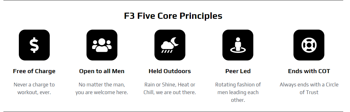 I found this quote from ‘Freed to Lead’ incredibly valuable over the last month or so. I saw evidence of it in myself over the last year, and the pax opened up and shared some perspective on how it applied outside of fitness and into our marriages, children, and the mentality of abundance. We shared that when F3 first started several people came up with ‘pet projects’ that were initially considered distractions – helping a charity, building homes, etc. But it turned out these ‘distractions’ were the result of the men being fit and friended, and they ended up becoming the goal of F3 – to reinvigorate male leadership in communities. As our pax grows, we’ll begin to see these ‘pet projects’ and YHC highly encourages us to embrace them as strong second and third F opportunities.