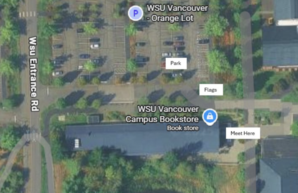 Enter campus via WSU Entrance Road from NE Salmon Creek Ave. Follow signs to WSU Bookstore. Park at the SE corner of the Orange Lot, near the bookstore.